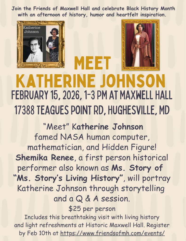 Living History, “Meet” Katherine Johnson at Maxwell Hall! Tickets are required and can be purchased through EventBrite https://www.eventbrite.com/e/living-history-katherine-johnson-at-maxwell-hall-tickets-1982157960819